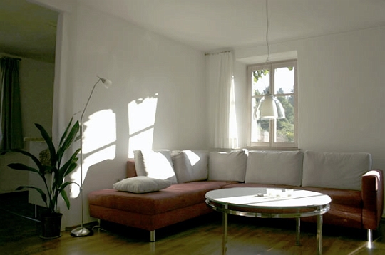 Typ: Private Ferienwohnung in einem künstlerisch gestalteten Haus, Wohnfläche 80 qm, 2 Schlafzimmer, Wohnzimmer, Bad, Wohnküche, Terasse, Garten, Kachelofen. Geeignet für 2 bis 6 Personen.